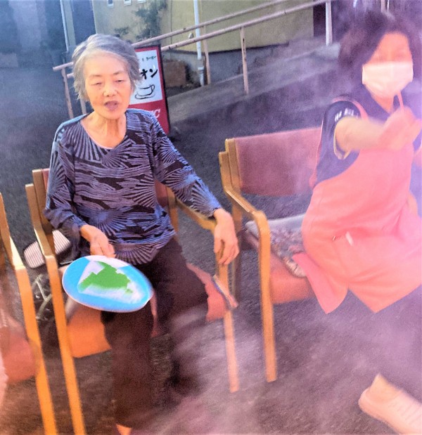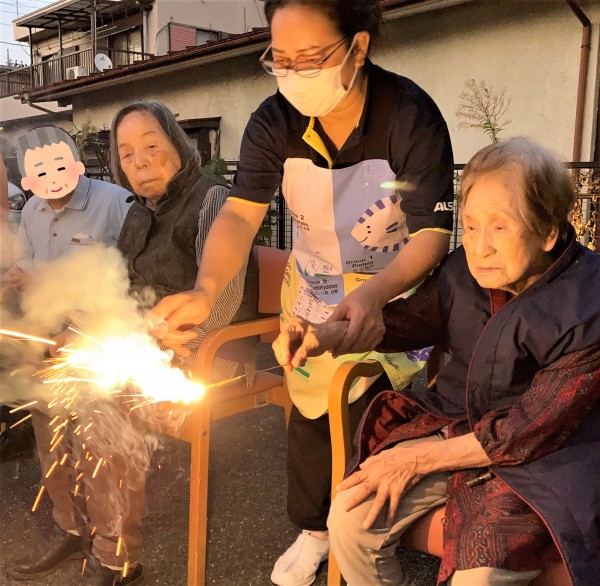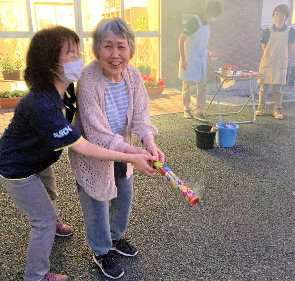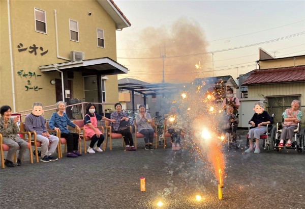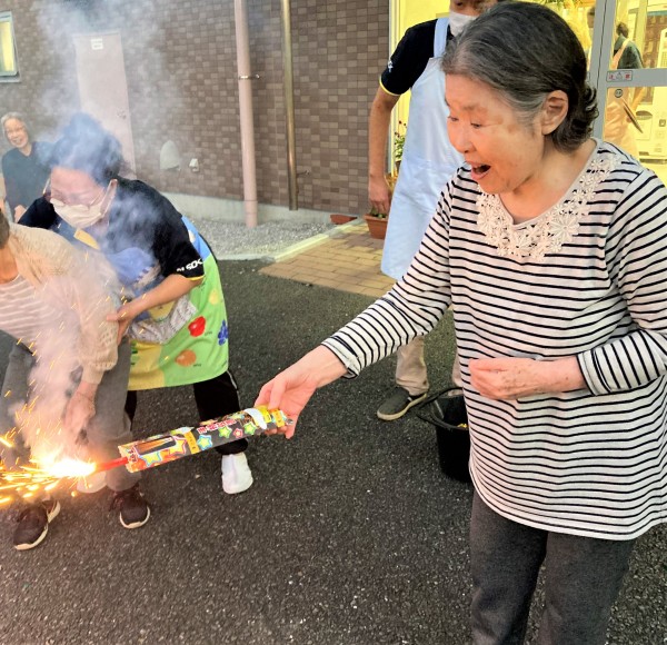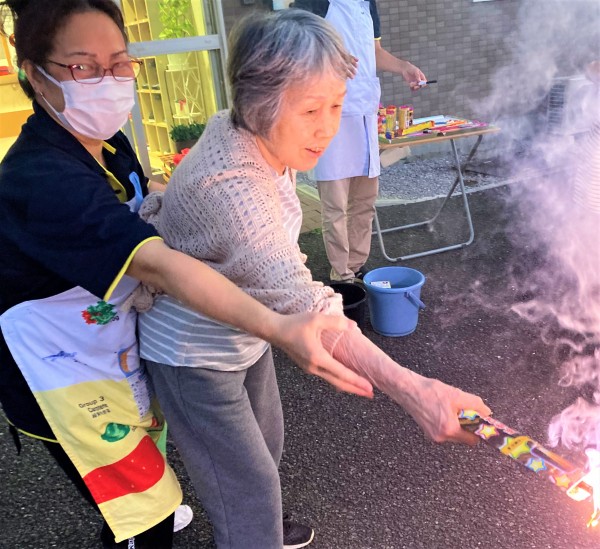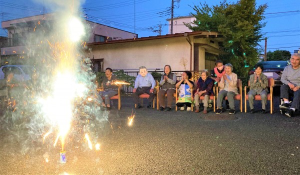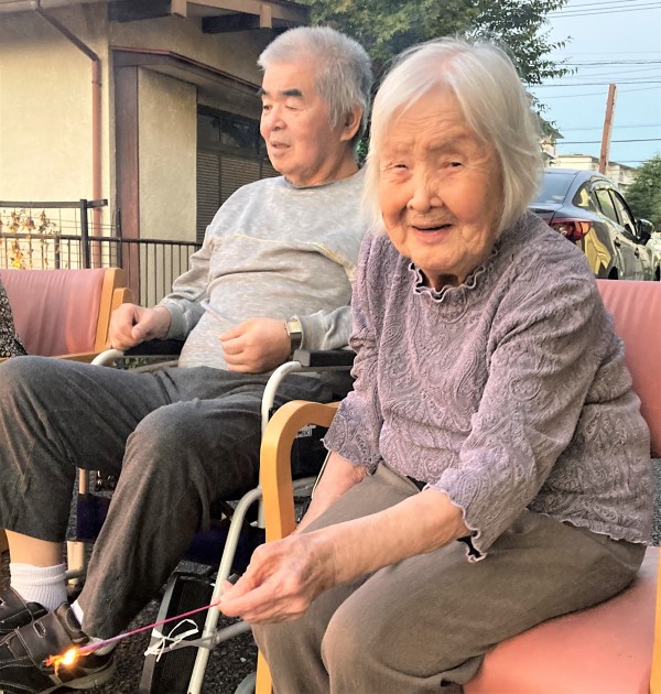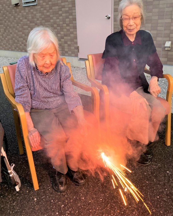 遅れて参加された最高齢98歳のW様も、締めの噴出花火が一番勢いに乗っているときに間に合いました。