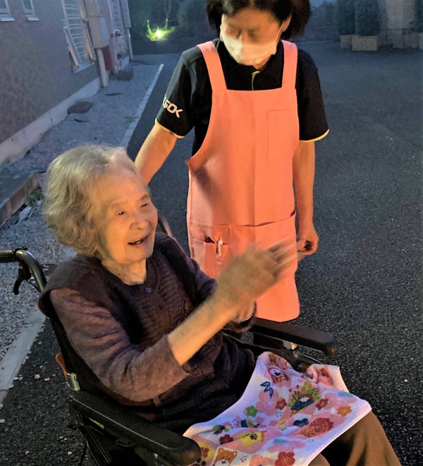 スタッフKと一緒に手持ち花火を楽しまれたO様は「きれいねえ…」とリラックスしておられました。