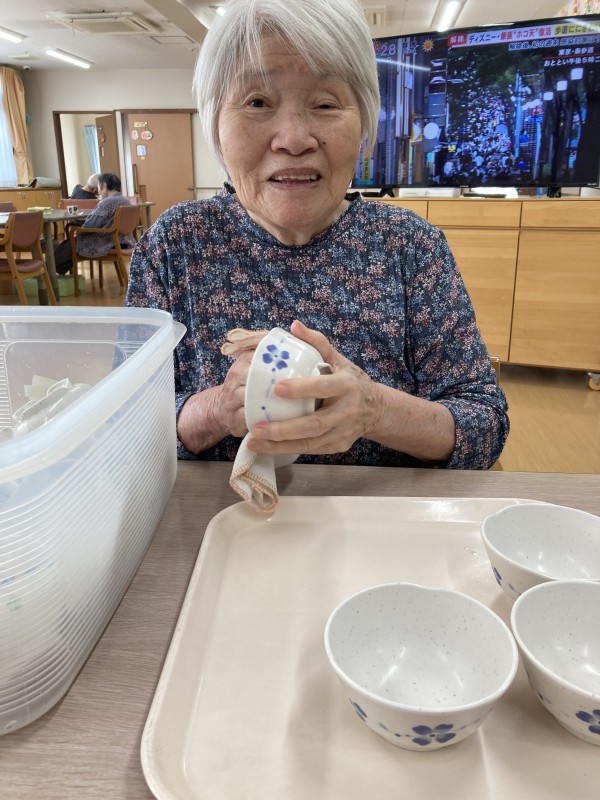 T様は、職員が洗い物や洗濯をしていると「ほら~(*^-^*)」と微笑みお手伝いしてくださいます♪