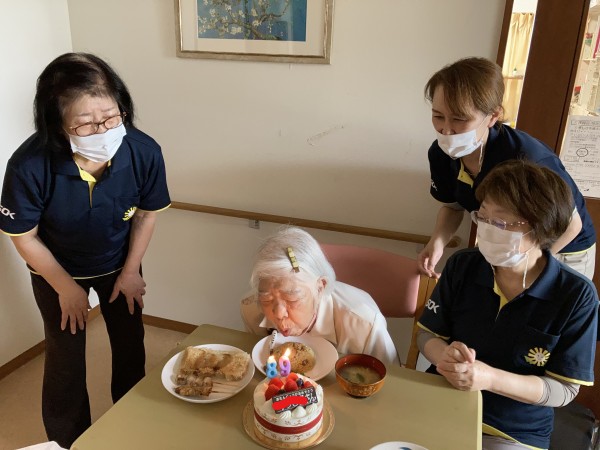 外食は控えたいので職員がテイクアウトで買って、スタッフに囲まれてお誕生日会!
