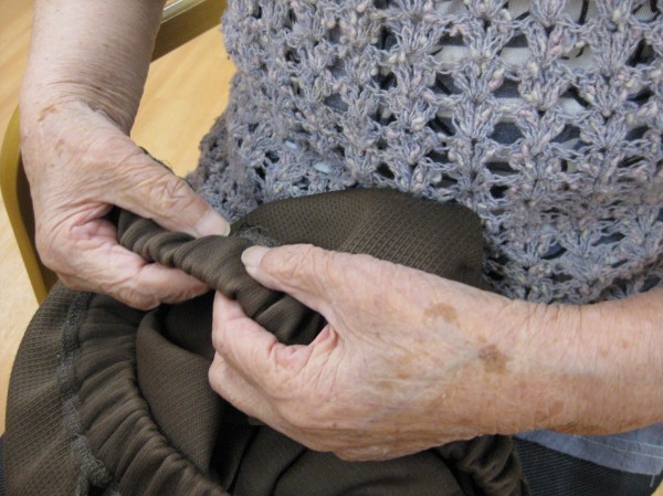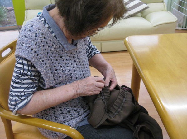 こんにちは!グループホームみんなの家・あきがせの介護ブログです。よろしくお願いいたします。ズボンのほつれ直しをされているご様子です。いつでも言って下さい。私、昔は洋裁やっていたのよ~??と嬉しそうに話されています。