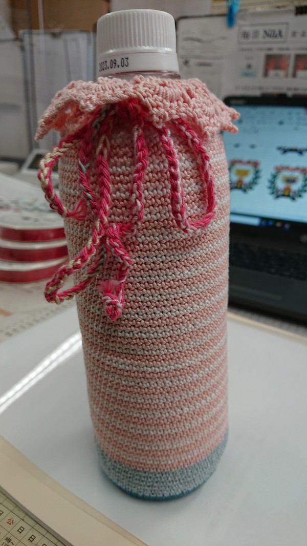 私のペットボトルホルダーも先日やっと縛る紐をくれて写真のような完成形のペットボトルホルダーになりました。