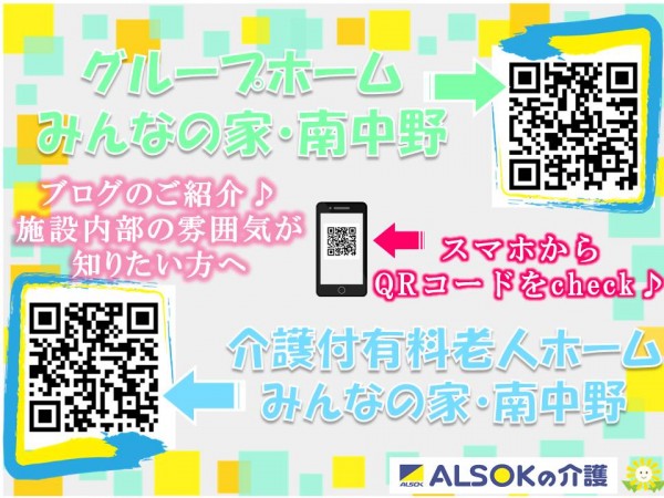QRコードはそれぞれグループホームみんなの家・南中野&介護付有料老人ホームみんなの家・南中野をご用意。
