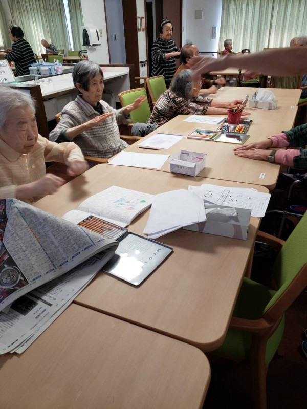 今日もフロアで皆さん看護師サンの指示の元腕を上げてストレッチ!!