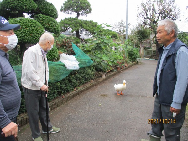 途中ご近所の方と立ち話をしたり、その方のお庭のみかんの木を見せてもらったり、そちらのお宅で飼っているアヒルに皆さん