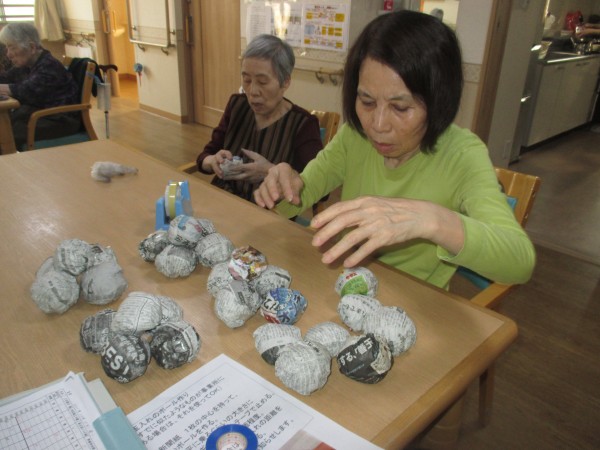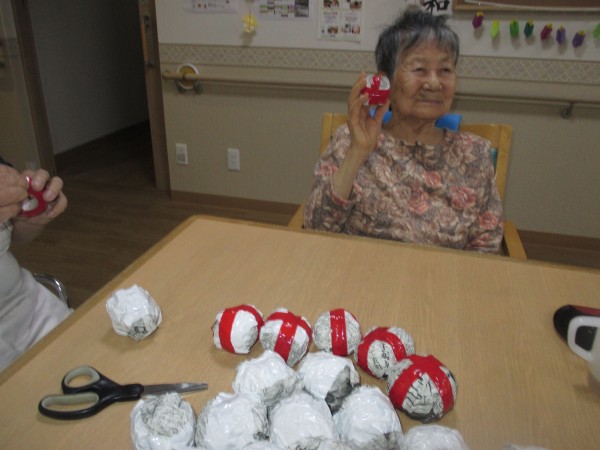 リモート大運動会で行う玉入れの玉作りをご入居者様と行いました。