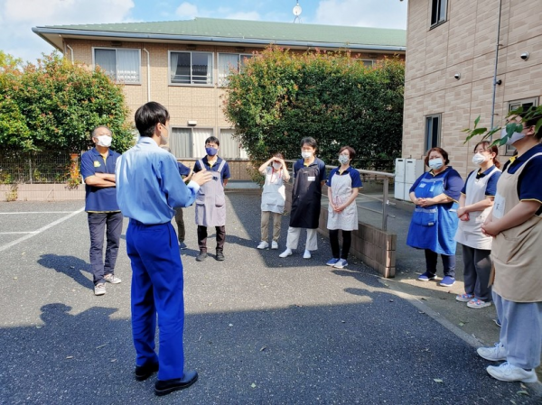 避難完了後各ホーム長から一言、消防署職員の方からも一言、その後、利用者様には各事業所にお戻り頂きケアスタッフが水消火器の訓練を行います。