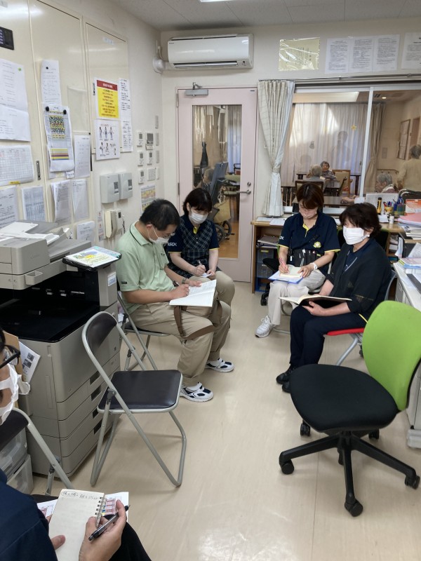 ご利用者様に少しでも快適に自分らしく生活して頂くために、職員同士で話し合ったり勉強会を常時開いています。今回の職員会議のテーマは、認知症の理解を深める事です。もちろん職員は介護支援専門員・介護福祉士・看護師・介護実務者研修等様々な資格を取得し仕事に従事しています。その為、認知症についてもある程度理解していますが、認知症の理解を深めるための研修はいくら行っても十分という事はありません。介護のプロとして日々の勉強会や研修を通じて、私たち職員も認知症を知り、認知症の症状があっても普段の生活をお楽しみ頂き、自分らしく生活する事が出来るようお手伝いさせて頂きます。また認知症の研究や理解は日々新たになっています。職員はいつでも最新の情報を学び、学んだ事を還元していきたいと考えています。認知症でお困りの方も多くいらっしゃると思いますが、介護や認知症で悩んだ時には是非ご相談いただければと思います。私たちはプロとして、認知症や介護についていつも学び最善のケアを目指して歩んでいきたいと考えています。
