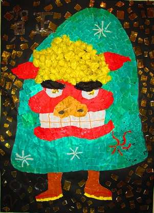 ![]() 赤い折り紙、緑の折り紙・・・ ちぎって貼って・・・ | ![]() 黒い折り紙も貼っていきます。 |