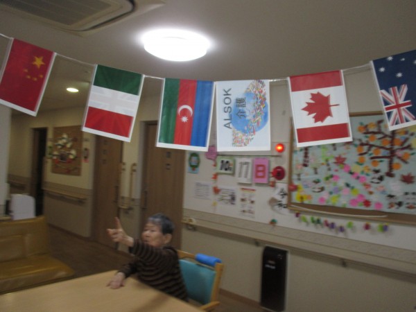 1階のフロアには万国旗が飾られて、運動会の準備が進んでいます。