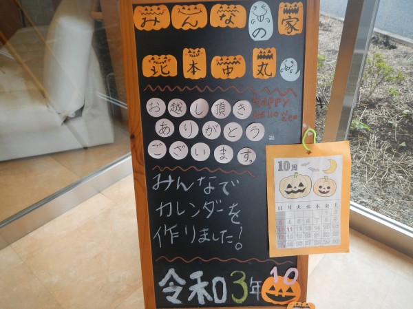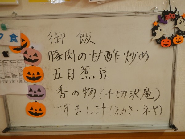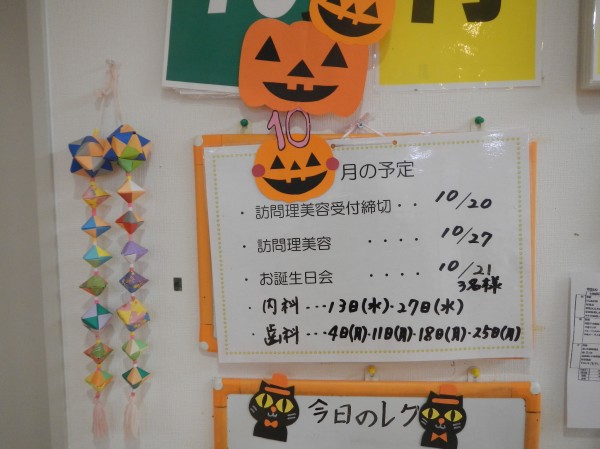 玄関のウェルカムボードを始め、ホールに掲示されているレクや献立のボードなど、ハロウィンカラーで染まりつつあります。