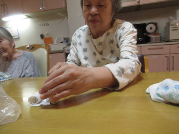 濡れタオルを一つずつ丸めていきます。