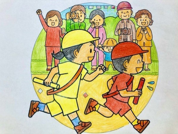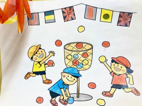 ぬり絵の飾りを書いてもらったり、入場門のお花紙を沢山折って頂いたり、天井の万国旗の天吊りもとってもいい雰囲気に出来ました!!