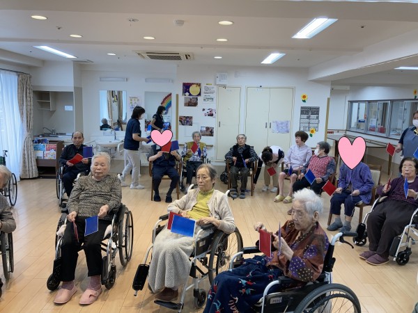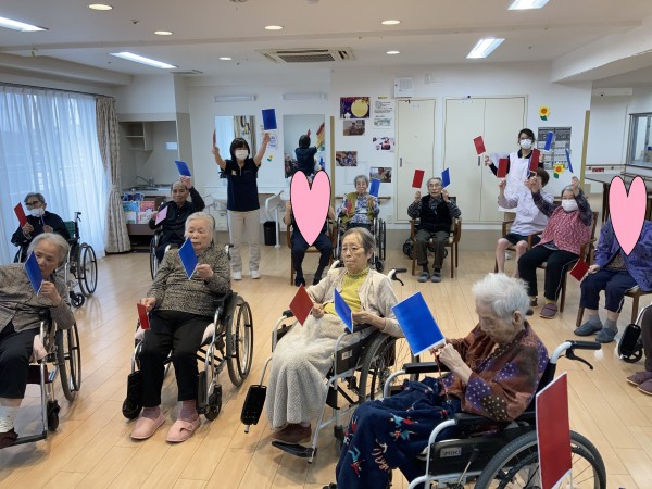 ご利用者様の皆様、手作りの旗を持ち、