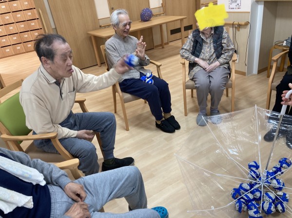 紅組と青組の分かれて、傘に次々に玉を入れて行きます。