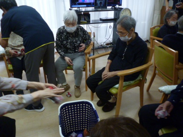 次の種目は玉入れです!新聞紙で作った玉をかごに入れて行きます!