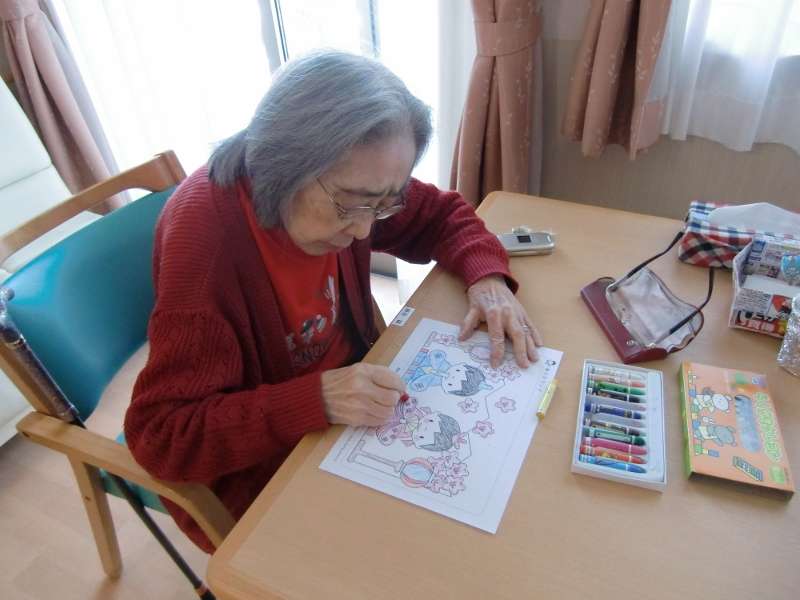 塗り絵の上手なご入居者3名様と、はさみ使いが得意なご入居者様に創作をお願いしました。