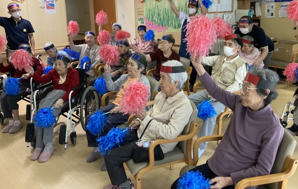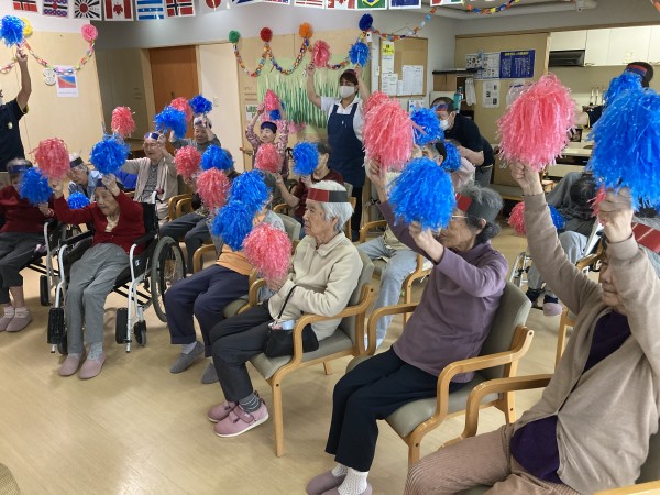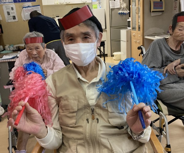 このゲーム、お題を出す人はひっかけようとするので間違えそうな気がしますが、結構皆さん間違えないんですよね。秘訣は鏡。ご利用者様には右手に赤、左手に青をもってやっていただいていますが、テレビ画面の中のインストラクターや前に出たスタッフは右手に青、左手に赤と皆様と逆に持っています。ご利用者様に分かりやすい様に、という事なんですが、皆さまは声を聞いてというより前のスタッフの真似をして旗をあげているようなんです。これだって難しそうですが皆様結構しっかりと前の動きに反応して旗を上げ下げされています。脳がばっちり働いている証拠なのかなって思います。