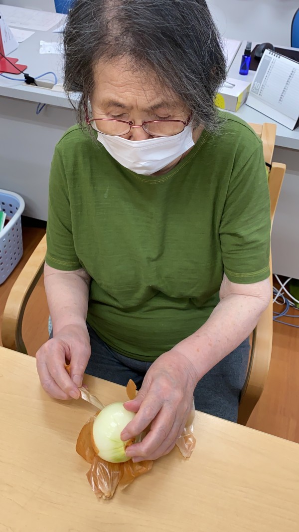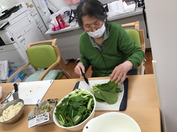 お腹いっぱいになれる様、リハビリを兼ねて沢山の野菜を切って頂きます!