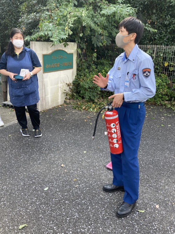本来なら近隣の方々にもお声がけをさせていただき一緒に訓練に参加していただくのですが、コロナ禍であることから、今回は消防署の職員の方のみの参加にて行ないました。・・・それだけにわたしたちスタッフの手順、役割分担などに焦点を当てた具体性のある訓練になりました。