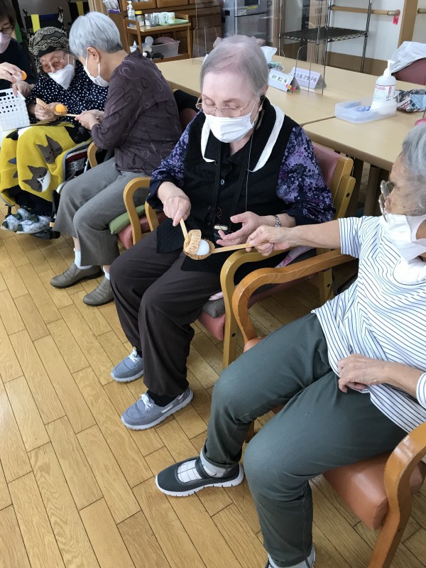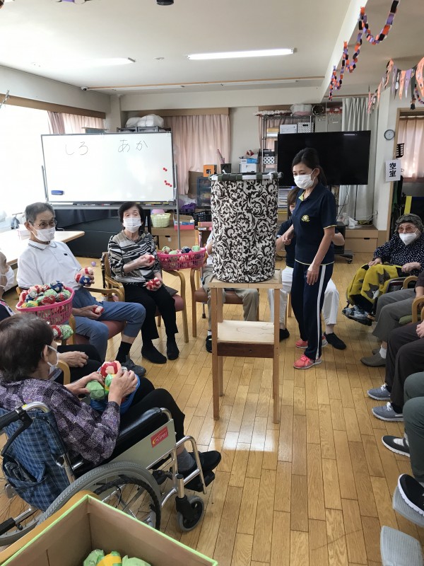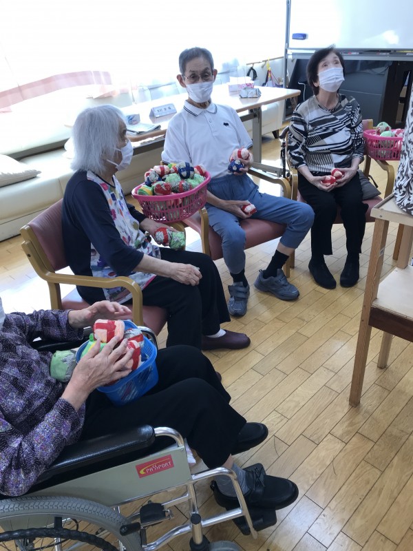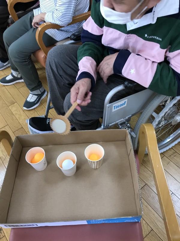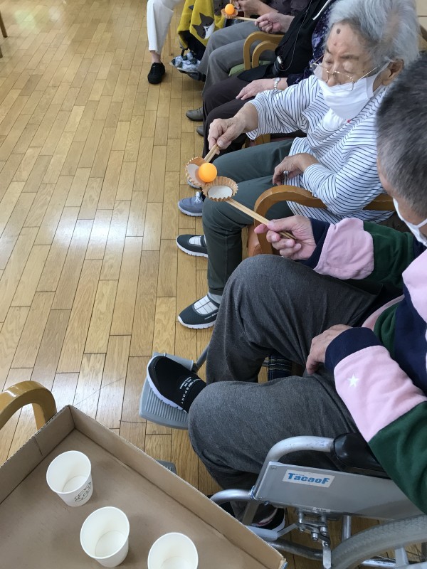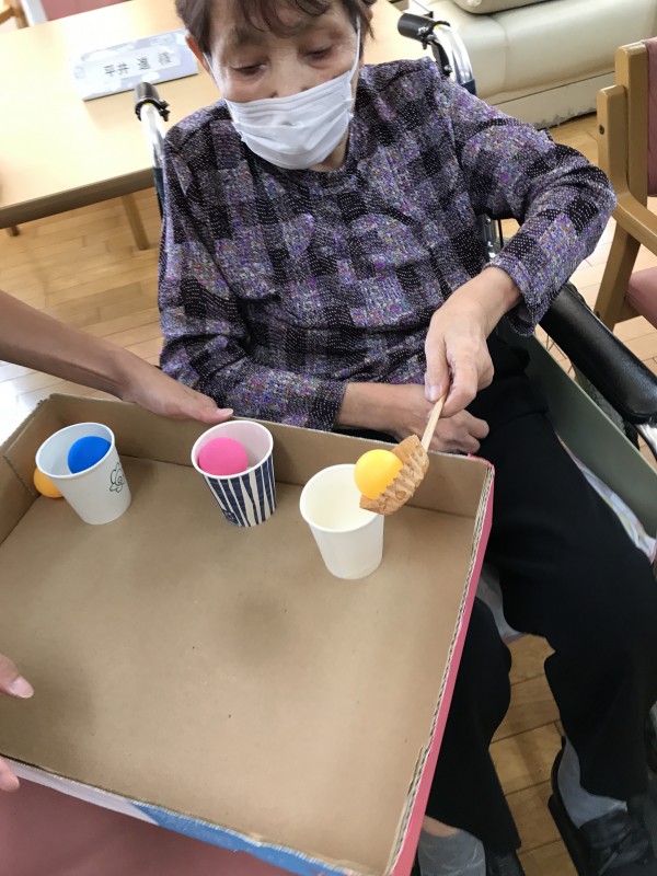 職員お手製の割り箸で作ったスプーンで、いろいろな大きさのボールを