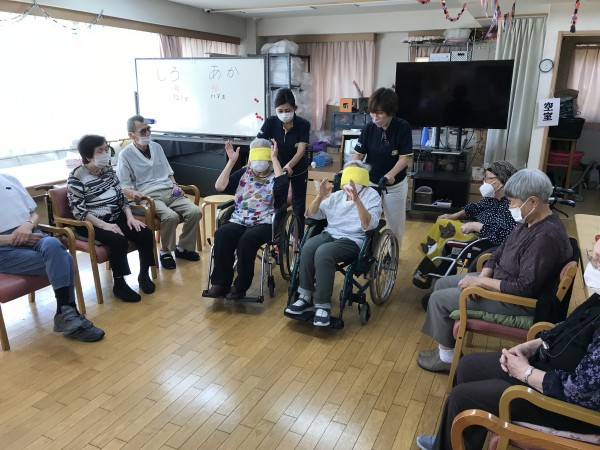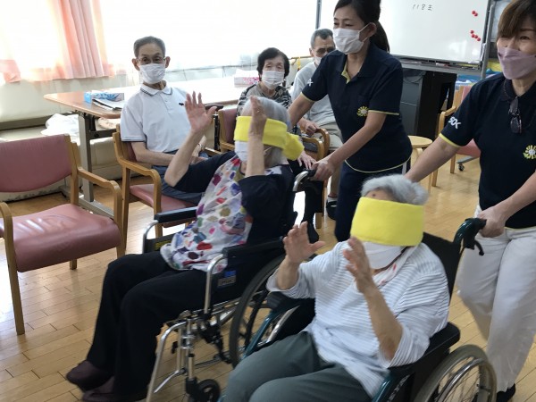 車いすに乗って職員が押す…は、いつもと同じですが、