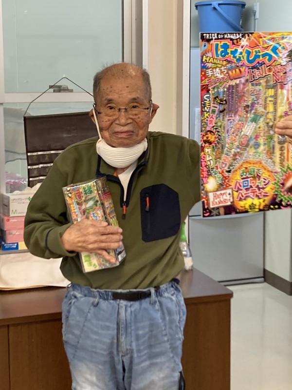 11月にも様々なレクを計画しています。先日のブログで紹介したイベントカレンダーには記載がありませんが、11月には花火レクを行う事にしました。11月に花火では時期が少し違いますが、夏では日の入りが遅いため、早くに休まれる方にはご参加いただく事が出来ません。少しでも多くの方にご参加いただくために早い時間に日の入りとなる11月に花火レクを開催する事にしました。(12月に開催すると今度は寒くなってしまうためやはり11月が無難という事になりました)10月28日にはリモート体操が行われ、体操の為にお集まり頂きました皆様に「来月のイベント予定の一部 花火 」の説明をしたところ、楽しみだと大変喜んでくださいました。写真は「花火やったー!」と喜んでくださっているところの写真です。