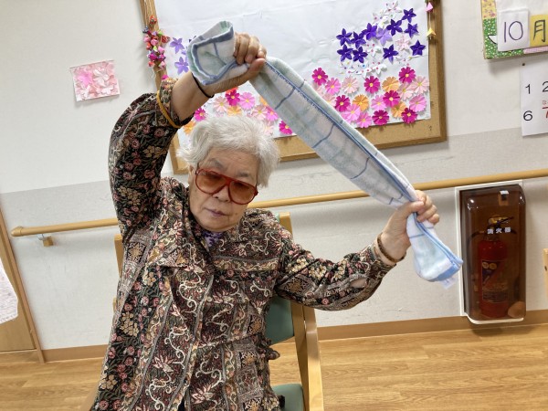 10月25日に2階フロアにて岡庭先生のもと、タオル体操を行いました。最初は少し緊張されていたせいか、動きが少なかった方も