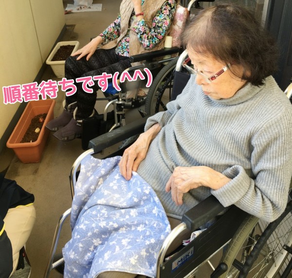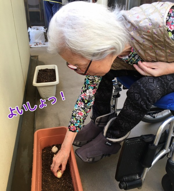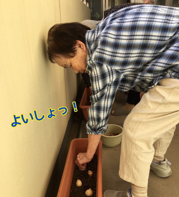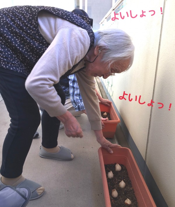 お天気も良いので、お花好きな他の御入居者様達も、よいしょと球根植えに挑戦です!