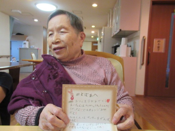 その後、ご家族から送られてきたプレゼントのカーディガンをお渡しすると声をあげて喜ばれていました(^^)/