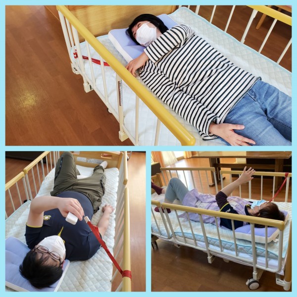 今回は、身体拘束をされたらどのような状態、気持ちになるのかを疑似体験しました。