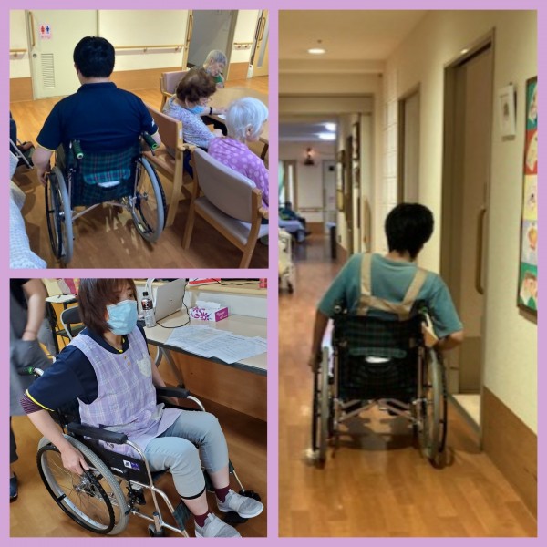 ▲喋れない状態で、車イスを自走しながらフロアやご入居者様のなかに混ざります。