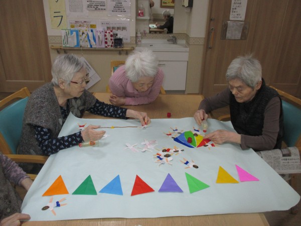 1階のご入居者様にも、運動会の様子を思い出しながら飾りを貼っていただきました。