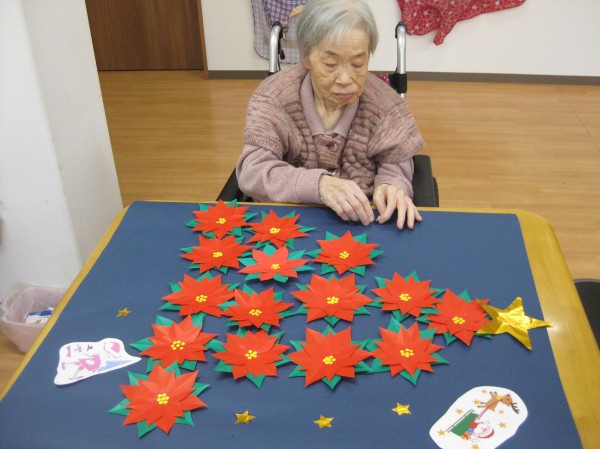 季節のお花ポインセチアでクリスマスツリーの貼り絵を作成しました☆