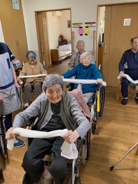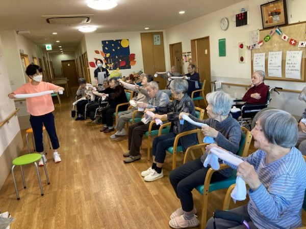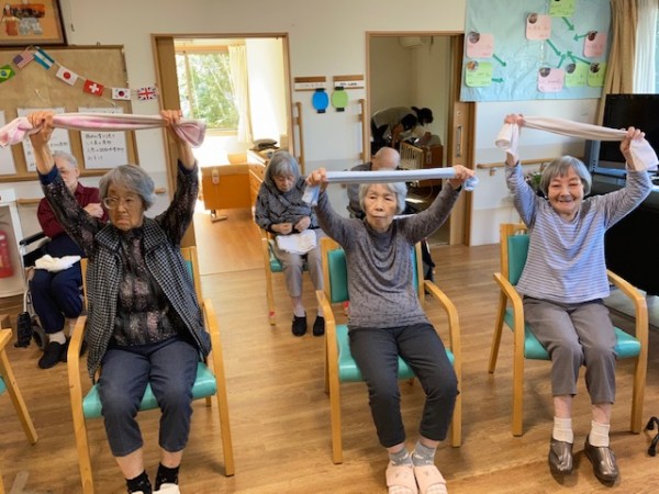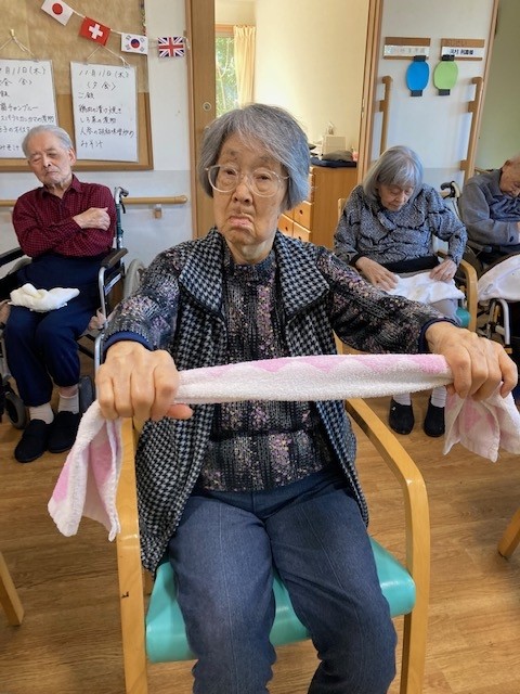 こんにちは!グループホームみんなの家・川崎新百合ヶ丘の介護ブログです、今日はAKトレーニング(ALSOK介護)の様子をお伝えします。タオル体操でいろいろなトレーニングに挑戦してみました。