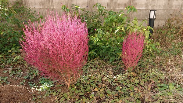 裏庭に「コキア(ほうき草)」が色づいてきました。