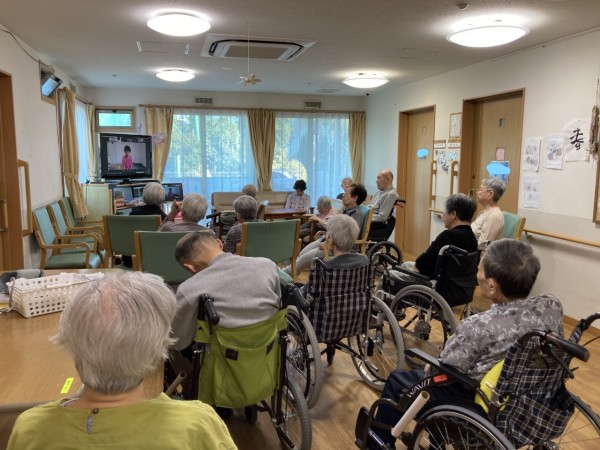 自分のホーム以外のみなさんの様子が見え、みんなで一緒に楽しく体操をしますので、これも社会参加の一つになります。