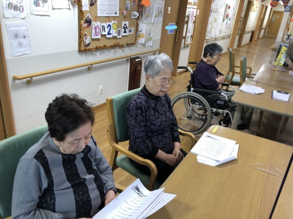 一方、わたしたちホームのみなさんのレクリエーションとしては、定番のカラオケや各種イベント、作品づくりに加えて、最近では、みんなで童謡を歌う(写真左/上・左2/上2・左3/上3)・トランプをする(同右/下)がマイブームになっています。