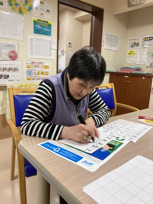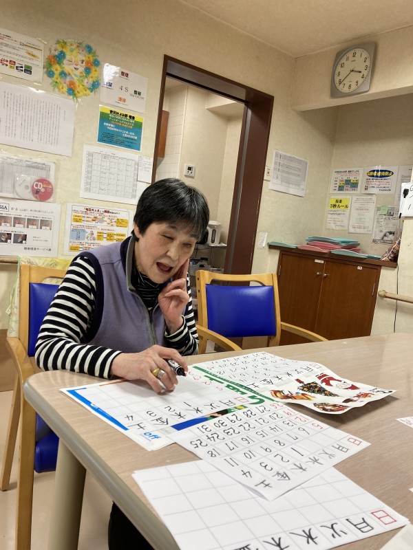 毎月中旬になると、翌月のカレンダーを作成します。フロアや月によって違いますが、今回はコピーした絵を切って貼り付けました。日付を書くのが一苦労。見本を見ながら慎重に書いています。「あれ?こうでいいんだっけ?」「わかんなくなっちゃう」と、数字と格闘しています。出来上がりは、各居室に貼られます。