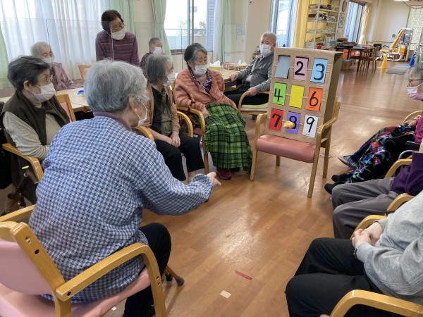 おはじきを数字の書いてある所に投げて、点数を競い合います。さてさて何点ゲット出来ますでしょうか⁈