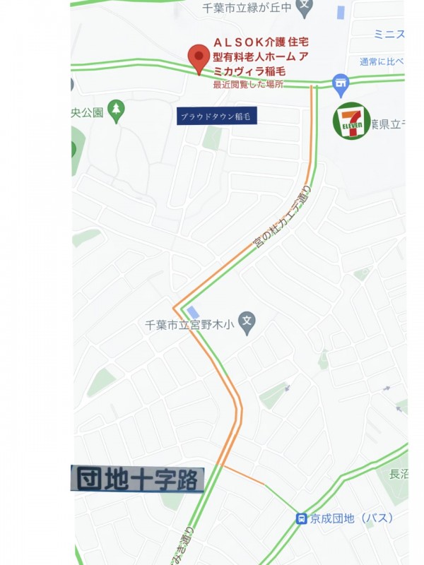 バスに乗り終点の京成団地のひとつ前『団地十字路』で降り、歩くとカエデ並木の散歩道が続きます。そのまま直進すると右手にセブンイレブンを見て左に行くと直ぐにアミカヴィラ稲毛に到着します。