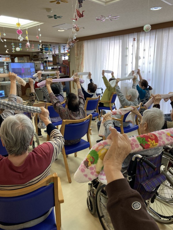 高橋先生指導のもと、タオル体操に参加しました。始まる前からタオルを手に持ち皆さん準備万端です!