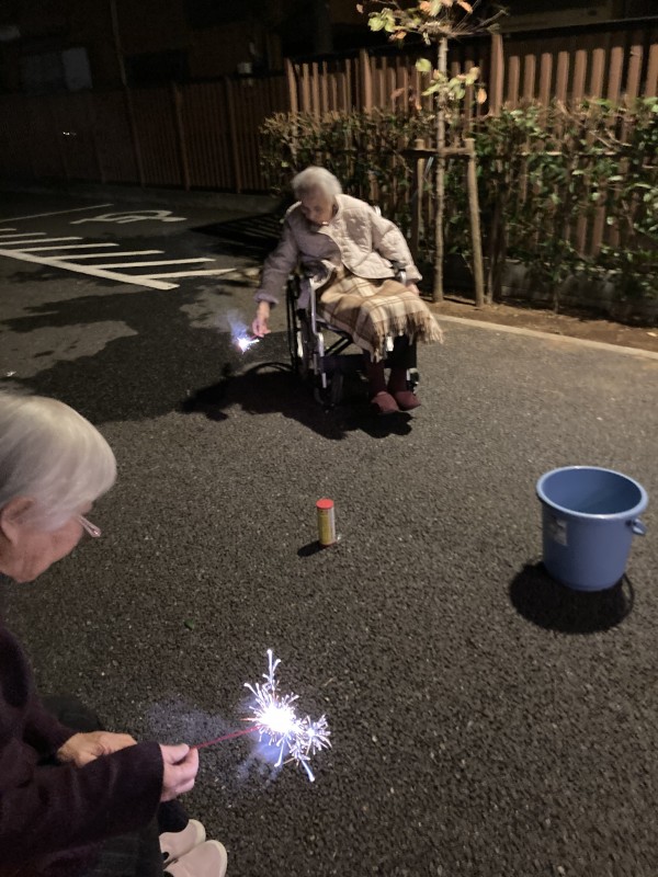 季節外れではありますが、11月に花火レクを開催しました。本来であれば真夏に開催したいレクリエーションですが、夏は日の入りが遅く、早くに休まれる方にはご参加いただく事が出来ません。なるべく多くの方にご参加いただくために季節外れではありますが、この時期に花火レクの開催となりました。(12月に花火レクを実施する案も出ましたが、12月では寒くなってしまうので、この時期の開催となりました。)