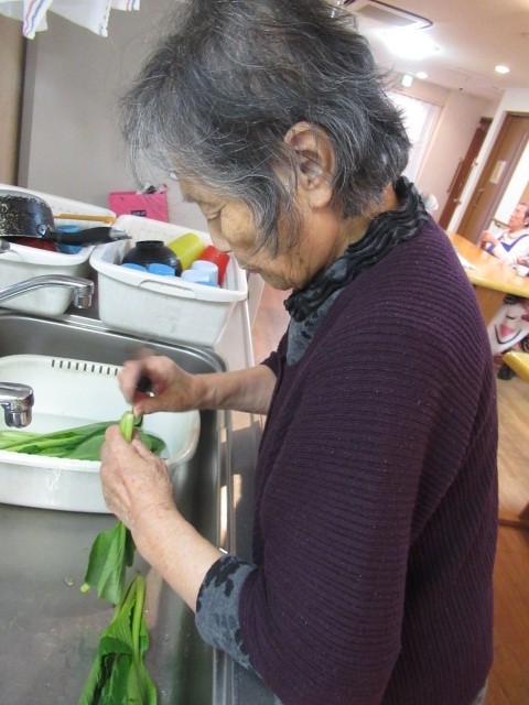 小松菜のおひたしを作ります。まずは、野菜を洗うところからです。「根っこの間に砂が入ってることがあるからね、よく洗わないとだめなんだよ」と洗い桶を用意。水を張り、1本ずつ丁寧に洗って下さいました。