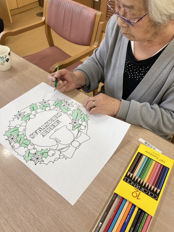 椅子に座って塗り絵の様子、クリスマスのリースの塗り絵を塗っていますね~(#^.^#)