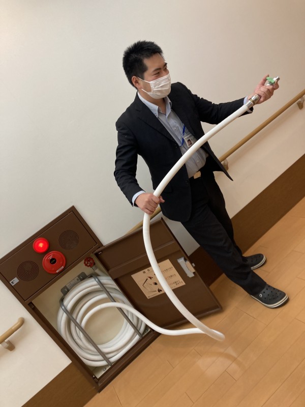 消防訓練を行う事が義務付けられていますので、みんなの家・中央区円阿弥のホームでも定期的に消防訓練を実施しています。コロナウイルスの新規感染者数は減りつつありますが、外部の方にまだお入り頂く事が難しいので、消防署職員の立ち合いはありませんでしたが、消防署の方が来た時と同様の訓練を実施しました。今回は通報訓練・避難誘導訓練・消火器、消火栓の使い方について(初期消火訓練)を行いました。