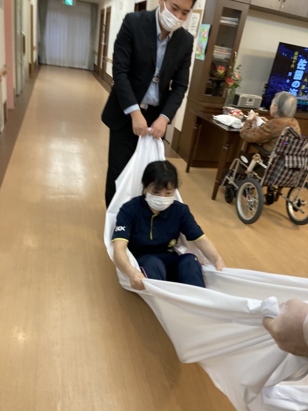 ご利用者様の避難誘導の様子です。今回の避難誘導訓練を実施しての総括として、通報等は迅速に対応出来ていましたが、避難誘導に思いのほか時間がかかってしまいました。万が一の際には職員自体も慌ててしまう事が予想されますので、定期的に訓練を行い、いつでも迅速に動けるように備えをしないといけないと感じました。