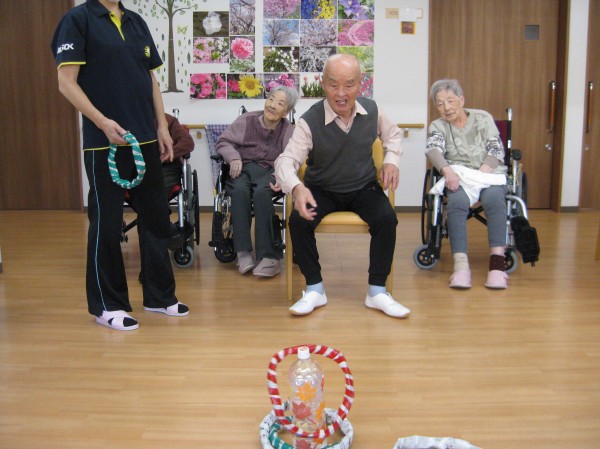 こんにちは!グループホームみんなの家・あきがせの介護ブログですよろしくお願いいたします。ゲームとして輪投げ遊びを行いました!!中々的の中に入らないよ・・・と悔しそうでした(´;ω;`)