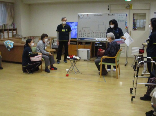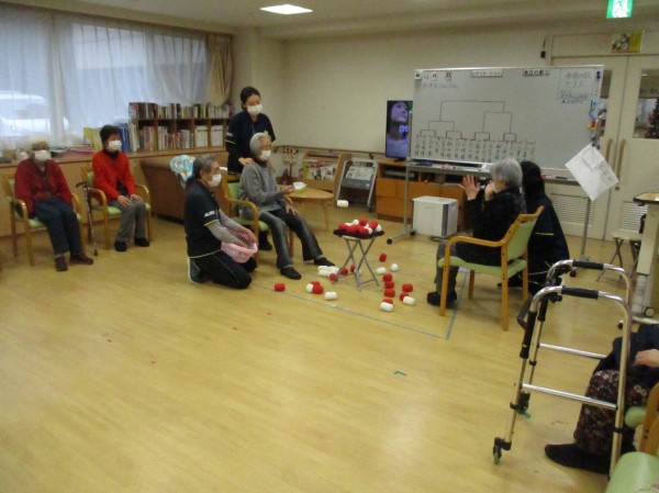 こんにちは!デイサービスセンター遊 西東京です。今日の運動レクレーションは『お手玉ツムツム』です。