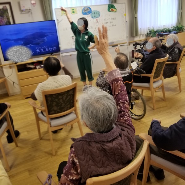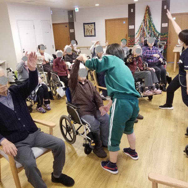 こんにちは。本日は職員がインストラクターになり、音楽に合わせて体操しました